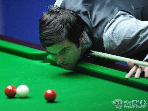 2011年4月18日,英格兰选手奥沙利文在比赛中观察球路。当日,在英国谢菲尔德举行的2011年斯诺克