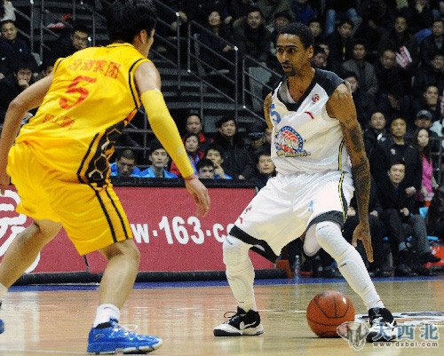 2011年2月23日,新疆广汇队队员昆西·杜比(右)在比赛中胯下运球。当日,在2010-2011赛季中国