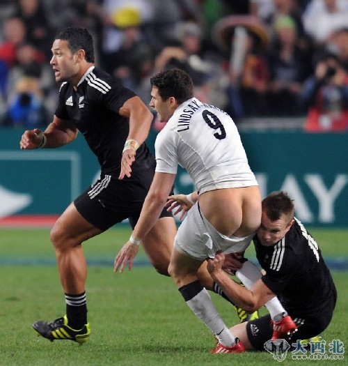 2011年3月27日 ,英格兰队球员黑格(中)在比赛中被对手扯下裤衩。当日,在香港大球场举行的香