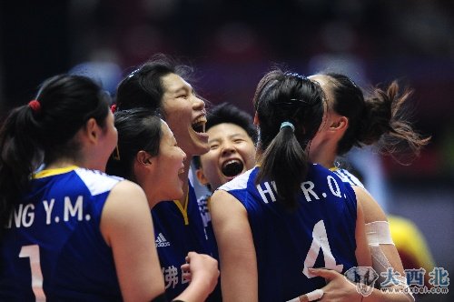 2011年11月18日,中国队队员在比赛中庆祝得分。 当日,在日本东京举行的2011年女排世界杯最后一