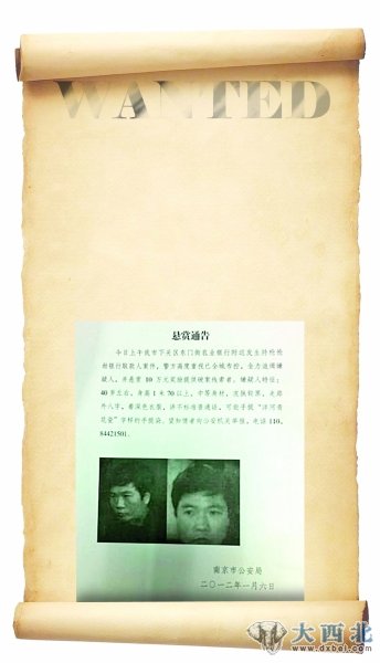 今日上午我市下关区东门街农业银行附近发生持枪抢劫银行取款人案件,警方高度重视已全城布控,全力追缉嫌疑人,并悬赏10万元奖励提供破案线索者。嫌疑人特征:40岁左右,身高1米70以上,中等身材,皮肤较黑,走路外八字,着深色衣服,讲不标准普通话。望知情者拨打025110。