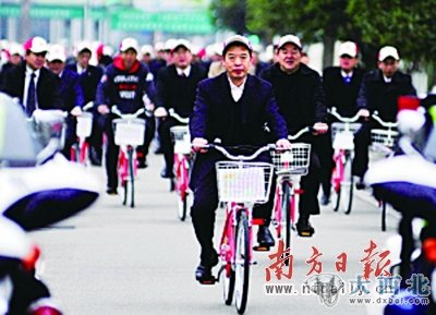 而据1月1日的《温岭日报》报道,去年12月31日,温岭市举行“社会保障市民卡暨公共自行车启动仪式”,市委书记周先苗等市领导和与会人员一起,“骑上崭新的公共自行车,沿锦屏公园四周路段,宣传公共自行车服务(如右下图)”。据报道,有3000辆车投入到该市60多个站点。