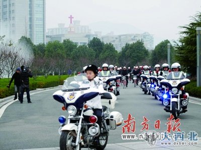 警车开道确有其事,“我估计他们是想以示隆重”。一共十辆摩托警车,其中最前面是两名女交警。跟在警车后面的有一百多辆自行车,“应该是按职位高低,市委书记在最前面,后面有别的市领导,各个部门的领导等。”