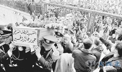 1月7日,在叙利亚大马士革,前一天“恐怖爆炸”死难者的棺木被抬入迈丹区的哈桑清真寺。新华社记者 李木子摄