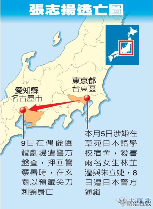 东京警视厅9日晚间举行记者会,宣布在东京涉嫌杀害林芷滢与朱立婕的张志扬已死亡。警视厅广报课主任熊谷对台湾媒体说,张志扬是在名古屋的一个SKE剧场看表演时(AKB48的姐妹表演团体),被警方发现。