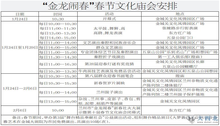 鑫报讯 金城金龙又闹春。由兰州市人民政府主办,中共兰州市委宣传部、兰州市文化广播影视新闻出版局等多家单位承办的第10届春节文化庙会于1月24日(正月初二)—2月6日(正月十五)在金城大剧院、金城关文化风情园区、五泉山公园、隍庙、东方红广场、张掖路步行街等地举行。
