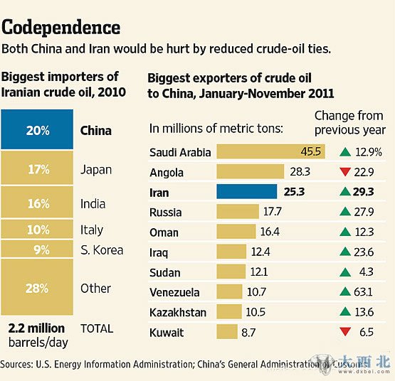2010年中国是伊朗石油的最大进口国(占比20%,其次为日本、印度、意大利和韩国),同时伊朗为中国2011年占比25%的第三大原油进口来源(前两位为45%的沙特和28%的安哥拉),且数量比2011年增加近30%。(资料图)