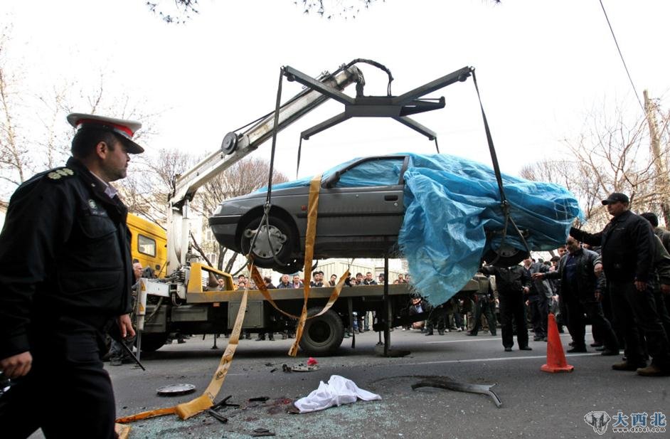 伊朗电视台播放的画面显示,爆炸发生后,遇袭小轿车被警方用帆布盖住顶部,车窗玻璃被炸碎,车底下血迹斑斑。警察在现场勘察情况后,一辆吊车将遇袭车辆运走。