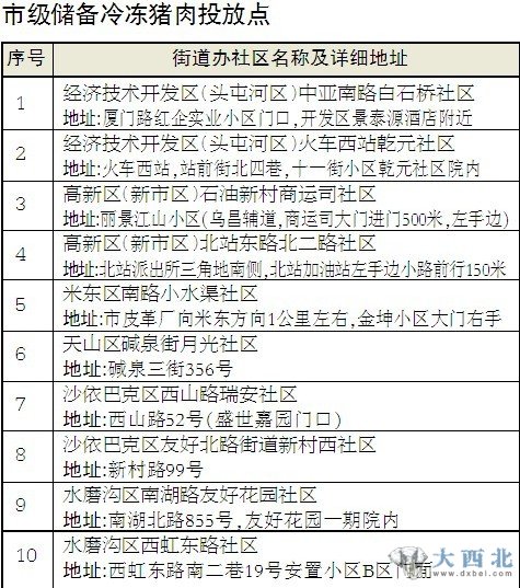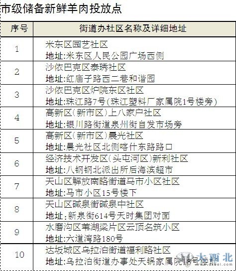 此次投放政府储备肉,共设置新鲜羊肉投放点10个,其中天山区2个、沙依巴克区2个、水磨沟区1个、高新区(新市区)2个、经济技术开发区(头屯河区)1个、米东区1个、达坂城区1个。共设置冷冻猪肉投放点10个。其中天山区1个、沙依巴克区2个、水磨沟区2个、高新区(新市区)2个、经济技术开发区(头屯河区)2个、米东区1个。