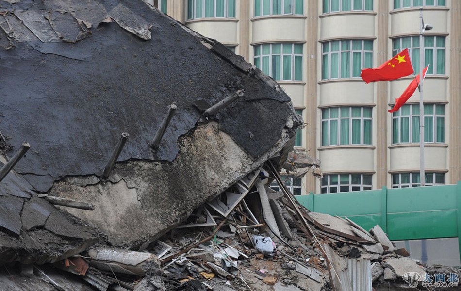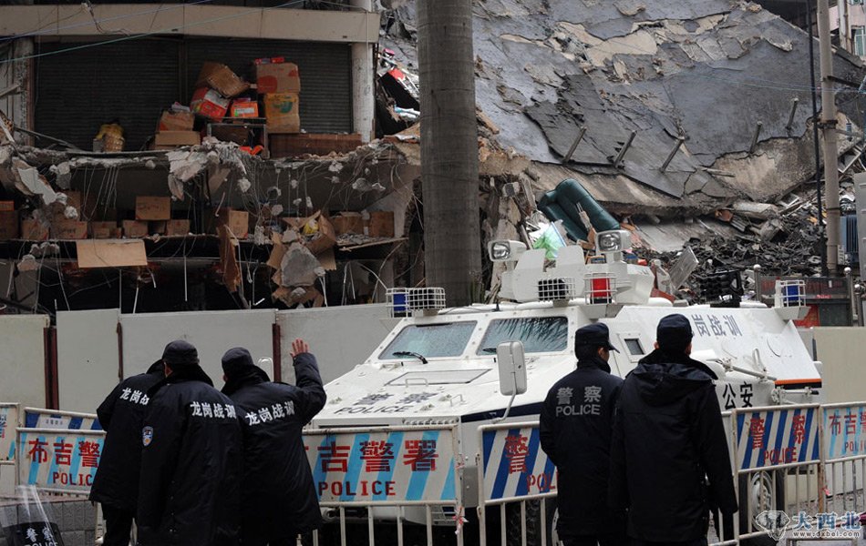 除夕夜,深圳龙岗布吉街道新乐路的布吉综合市场外,拆迁承包商雇佣500余人围住市场,燃放爆竹掩盖违法强拆。三层楼高的市场被挖塌一部分,一些商铺物品埋进废墟。布吉派出所出动100余警力阻止,被强拆人员包围,闻讯而来的200余商户与强拆人员起冲突,警方调动防爆装甲车才将现场控制,数人冲突中受伤被送往医院。图为遭遇强拆的布吉综合市场25日仍被布吉警方严密封锁,坍塌了近一半的建筑面目全非。