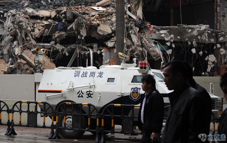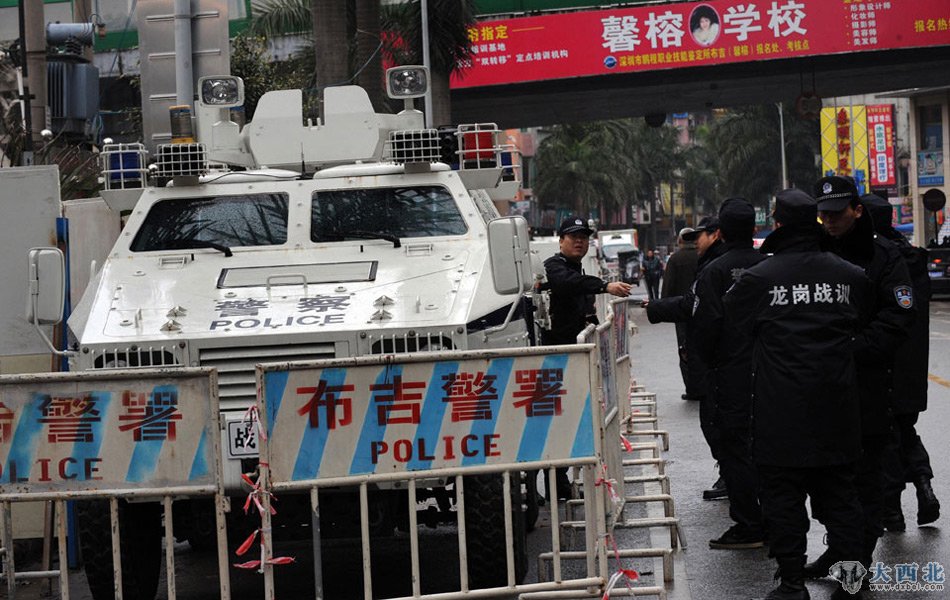 大年初一凌晨,深圳龙岗布吉街道新乐路的布吉综合市场,拆迁承包商雇用500余人围住市场,燃放爆竹掩盖违法强拆。三层楼高的市场被挖塌一部分,一些商铺的货物被埋进废墟。布吉派出所出动百余警力阻止,被强拆人员包围,200余商户与强拆人员起冲突,警方出动防暴装甲车才将现场控制。图为防暴车在现场值守。