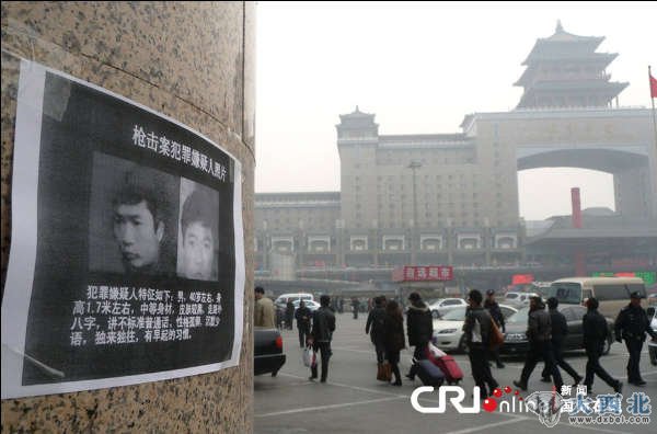 2012年1月16日,行人从北京西站附近商场、餐馆张贴的南京嫌犯“通缉令” 旁经过。