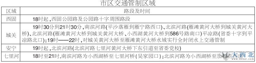 为确保市民的安全,今日18时起,西固区、七里河区部分路段交通管制,19时起,安宁区、城关区部分路段交通管制,机动车和公交车须绕道而行。