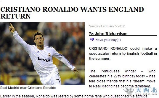 要求过于严苛的皇马球迷,正将C罗渐渐推离伯纳乌。据英格兰《每日快报》透露,C罗已经告知家人朋友,他非常想念老特拉福德,特别是想念曼联主帅弗格森,他一直把老爵爷当成第二个父亲。在经历了三年西甲生涯之后,英超对C罗重新具有了巨大的吸引力。C罗想走,皇马也不会拦着不放。大部分皇马会员希望送走独狼型的C罗,弗洛伦蒂诺对此也心知肚明。