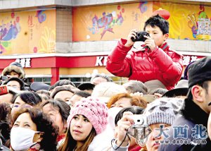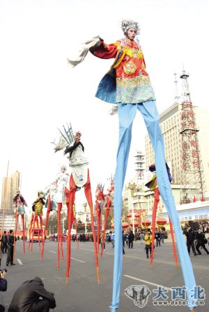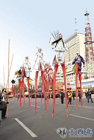 昨日一大早,来自四面八方的人群便向兰州东方红广场集中,而参加社火展示活动的表演队伍更是早早地在庆阳路集结。一时间,东方红广场上万人云集,彩旗招展,龙飞凤舞,鼓乐喧天,充满了喜庆、热烈、欢乐、祥和的节日气氛。10时,“金龙闹春”第十届兰州春节文化庙会闭幕式暨2012新春社火展示活动正式举行。