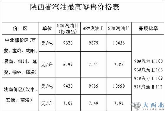陕南价区(汉中、安康、商洛)93号汽油为每升7.49元;97号汽油为每升7.91元;90号汽油为每升7.07元;0号柴油为每升7.39元;-10号柴油价格为每升7.83元。