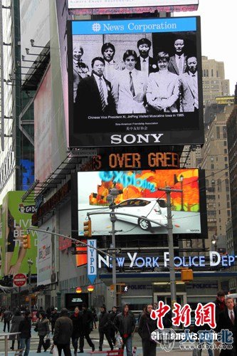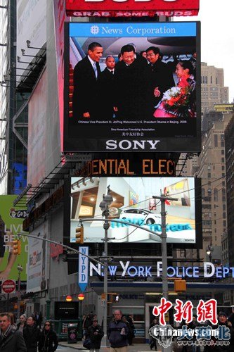 当地时间2月14日,纽约时报广场巨型屏幕播放“美中友谊,见证历史”宣传片,热烈欢迎中国国家副主席习近平访问美国。图为习近平2009年在北京迎接美国总统奥巴马访华的照片正在屏幕上播放。 中新社记者 李洋 摄
