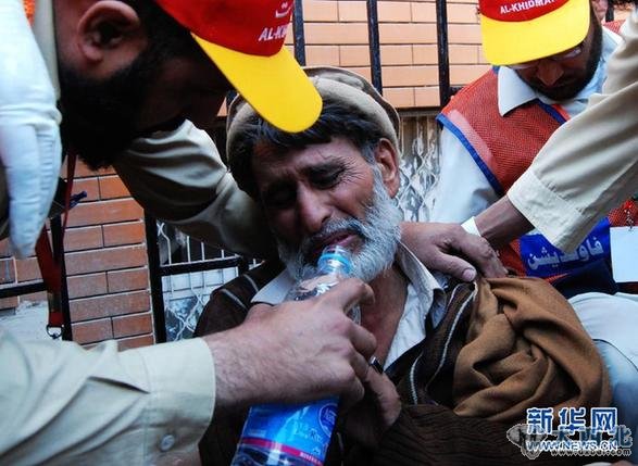2月23日,在巴基斯坦西北部城市白沙瓦的一家医院,一位老人因儿子在爆炸袭击中丧生悲痛不已。 新华社发(奥马尔·加尧姆摄)