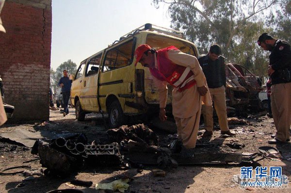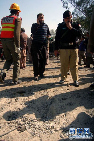 2月23日,在巴基斯坦西北部城市白沙瓦,救援人员查看发生爆炸的公交站。白沙瓦一公交车站当日上午发生炸弹爆炸,当地媒体说已造成至少15人死亡,约30人受伤。 新华社发