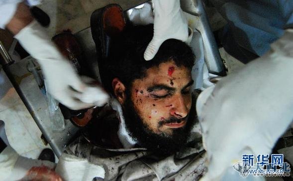 2月23日,在巴基斯坦西北部城市白沙瓦的一家医院,一名在爆炸袭击中受伤的男子接受治疗。 新华社发(奥马尔·加尧姆摄)