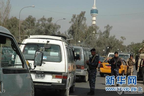 2月23日,在伊拉克首都巴格达,军警在距爆炸发生地点不远处设卡检查过往车辆。 当日,包括首都巴格达在内,伊拉克十余座城市发生连环袭击事件。 新华社发(巴沙尔摄)