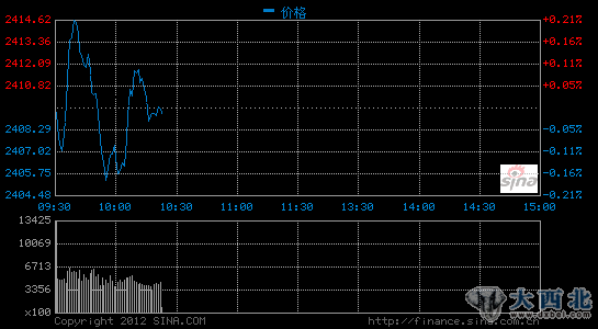新浪财经讯 沪深股市开盘后震荡走低,盘面上,智能电网、煤炭、券商、环保、传媒娱乐板块涨幅居前,陶瓷、水泥、汽车、造纸、造船板块领跌。截至发稿,沪指报2405点,跌0.17%;深成指报9915点,跌0.04%。
