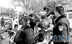 昨日下午, 七里河交警同协管人员一起将一辆辆查扣的摩托车装运。当日,七里河交警对摩托车违章进行集中整治。记者现场采访一个多小时,查扣证照不全、无牌上路等违章摩托14辆。 (责任编辑:鑫报)
