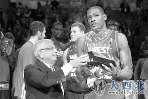 实际上,2011年洛杉矶全明星赛,杜兰特就险些拿到MVP,当时他首发出场,出战30分钟扮演搅局者角色。他23投11中贡献了西部第二高的34分,仅次于最终的MVP科比。第四节关键时刻,杜兰特连续命中两球为西部队稳定局势,同时也为科比最终拿下MVP奠定了基础。