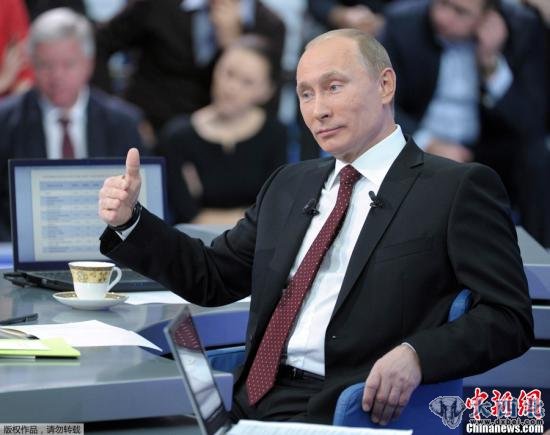 资料图:2011年12月15日,俄罗斯总理弗拉基米尔·普京在电视、广播、网络直播节目中与普通民众直接交流,回答提问。