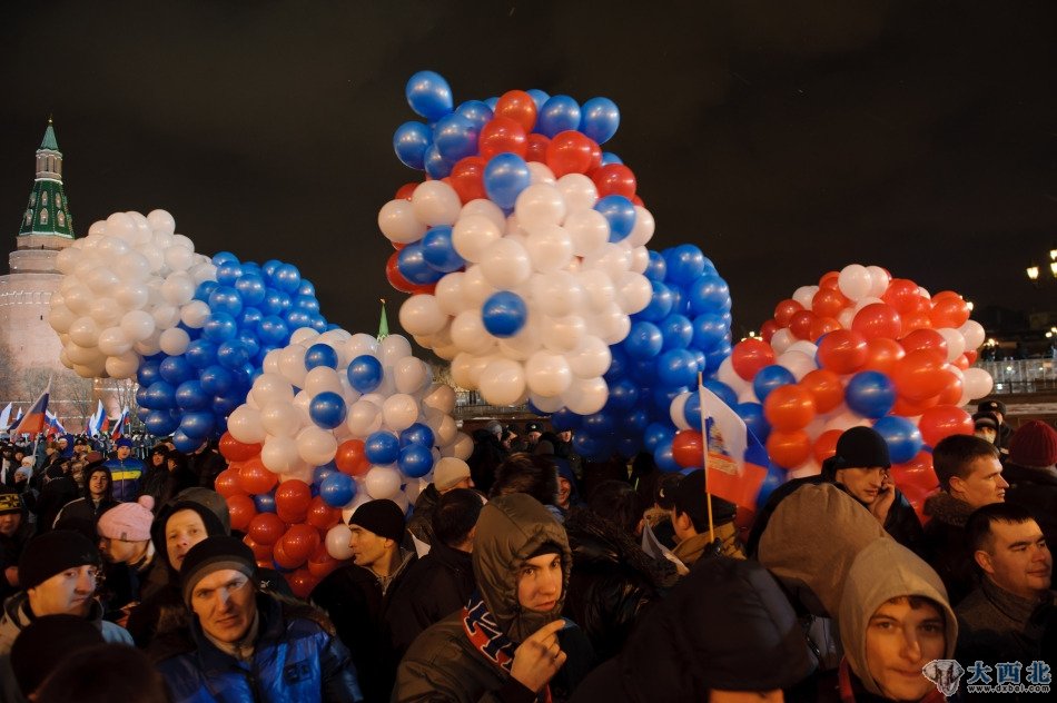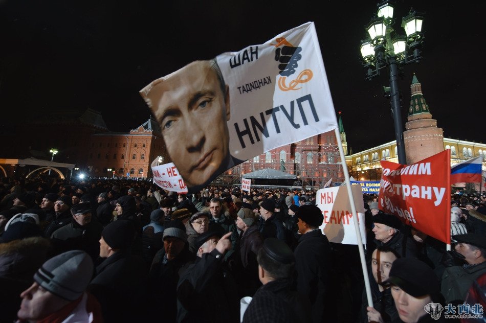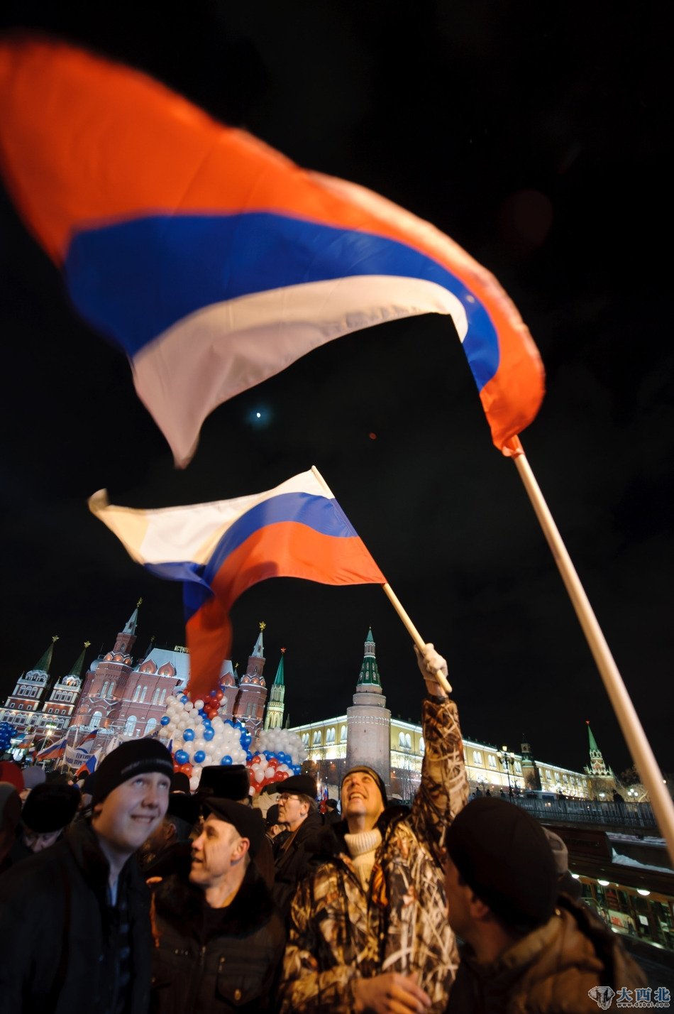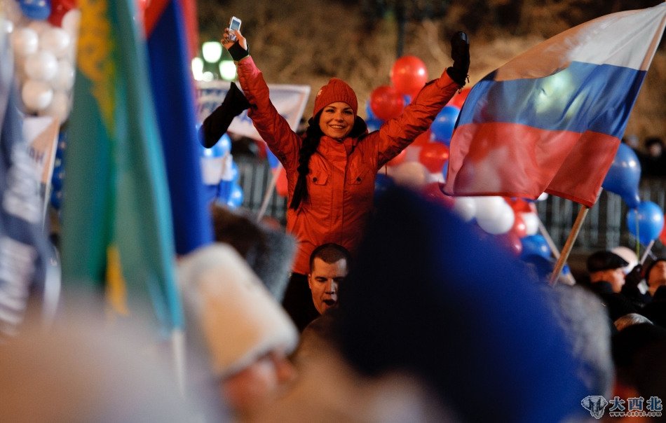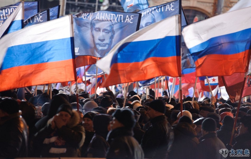 2012年3月4日,出口民调显示俄罗斯现总理普京赢得总统选举。在俄罗斯首都莫斯科马涅什广场,普京支持者庆祝普京胜出。