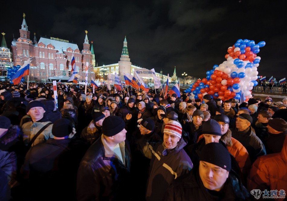 3月4日,在俄罗斯首都莫斯科马涅什广场,普京支持者庆祝普京胜出。当晚,俄罗斯首都莫斯科马涅什广场、特维尔大街等地区聚集了超过11万名普京支持者。