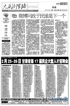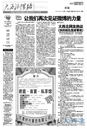 可能在两年前,织“围脖”对于兰州人来说还是个新鲜而又模糊的词儿,但谁也没料到,不久后的今天,微博却以突然的方式爆发。有人问:那是一种什么方式?答案是:围观的方式。“关注就是力量,围观改变社会。”这是时下网络上很热的一句话,有时候,一条看似普通不过的微博却因为“围观”而迅速变成一种社会普遍力量,从而产生某种神奇的促进行业乃至社会进步的推动力。