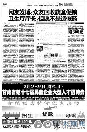 2月22日18时19分,省卫生厅厅长刘维忠就此事再次发表了微博“今天已经安排省人民医院回收药盒,防止造假。试点成功后全省推广。”新浪博友“王岩兰州”随后发出信息称赞:高效威武的刘厅。