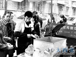 谈军酿皮在市场上渐渐受到顾客认可,甚至也有人大老远从西固、安宁来买他的酿皮。一位顾客说,一次他将谈军酿皮带给西宁亲戚,以后他到西宁亲戚指定让他带谈军的酿皮。谈军说,下一步他打算建立酿皮加工基地,把加工过程透明,让顾客能清楚看到整个加工过程。因为,食品卫生是顾客最关心的事情。