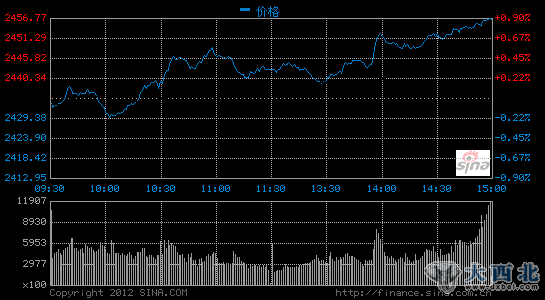 新浪财经讯 今日两市走出震荡上涨行情。早盘沪指考验10日线获支撑后,一路上攻,升破昨日高点,并几乎拿下2456点附近10月均线。截至收盘,沪指收光头阳线,5日均线再次拐头向上,与10日线形成粘合,欲再次穿越,成交量上,沪市与昨日持平。