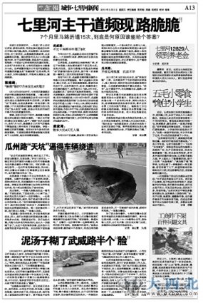 ”这是很明显的道路管理施工方面失责,行政不作为。“委员们说。他们建议,不管是发生在哪个路段的塌陷问题,都应该形成单位和和市政部门联动,及时修复道路,消除安全隐患,给老百姓一个安全的生活环境。对于目前已经存在的问题,委员们也建议,整顿工程发包、招投标、施工、监理等责任方,追究责任。