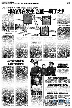 据当地居民介绍,龚家湾加油站前的坍塌面已经出现过4次塌陷,而且程度一次比一次严重,面积也是一次比一次大。在现场,记者也看到,宽不过10余米的道路上,一个宽约5米,长约12米的大坑横亘在马路中间。”这里是兰州市天然气主管道经过的路段,如果不按道路承载标准进行修复,这里将有很大的安全隐患。“马军说。他告诉记者, 兰州处于”湿陷型黄土地区“,此处若不及时处理,万一遇到自来水管破裂或者下雨, 积水渗入,必然引发更大的坍塌事故,给生产生活带来较大不便。