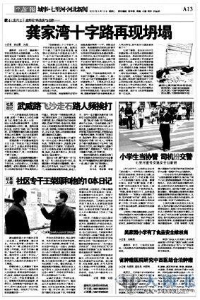 当委员们来到建西路十字时,虽然有三名交警在疏导交通,由于车流量大,路况差,东、南、北三个方向全都出现了堵车现象。该十字西南角的坍塌面上填埋的砂石也被过往车辆碾轧得坑洼不平,经过此地,车辆都会绕行,致使本来只有两个车道的武威路在此段变成了单车道通行。正在执勤的龚家湾交警大队丁队长一边疏通车辆,一边用脚将坑里的大石头往路边踢。”现在东南西北的进出城车辆都要从武威路过,每天的车流量大概在七、八千辆,而且都是重型车。前两天就有一辆大车轧起来一个石头把跟在后面的小车玻璃给打破了,这属于意外事故,我们也无法解决,当时两个司机就打了起来,整个武威路瘫了。这还不算什么,我们的一名交警在执勤时直接被飞过来的石头打在头上,住了好几天医院。这个路段现在的情况不管对车辆还是路人都比较危险。“