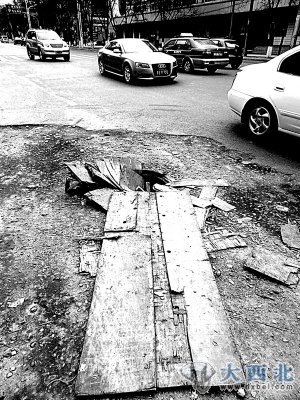 目前已经成为兰州交通要道的武威路不仅承载着城市交通,而且自去年开始,也承载起了过境公路的重任。或许是重型车辆过多的缘故,建西路十字四个角上三个角频频塌陷,其中西南角塌陷最为严重。在现场,龚家湾交警大队丁队长介绍,去年11月份,该路段进行重修,由于此处地段特殊,给施工增加了很大的难度。铺路时,施工方只是拉毛后铺了油。”这样的路段只进行拉毛处理,最少少了两道工序。“马军说。