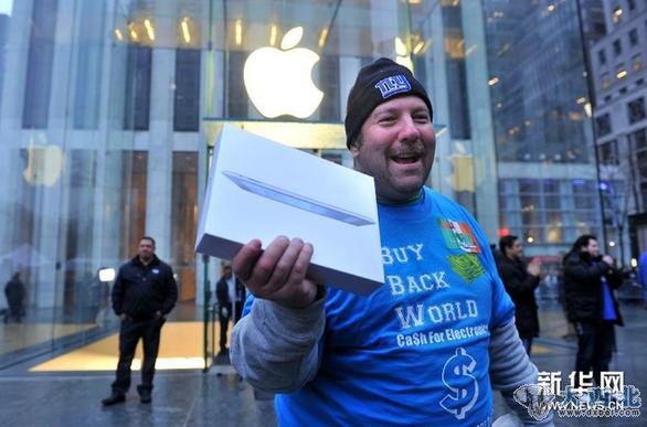 3月16日,一名当地居民在纽约曼哈顿第五大道苹果专卖店门前展示刚刚买到的新iPad平板电脑。当天,苹果新推出的第三代iPad平板电脑正式在美国发售,吸引了大批苹果产品爱好者争先抢购。更清晰的显示屏、功能更强的芯片和支持更高速无线网络连接等是新款平板电脑的主要卖点。新华社记者王雷摄