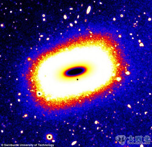 据报道,天文学家在一个由250个星系组成的星系团中发现了这个形状奇特的星系,该星系据地球约7000万光年。科学人员分析,这个星系可能是由两个螺旋星云相撞产生的。