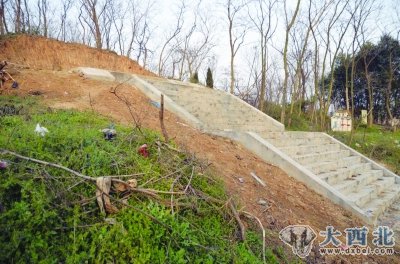 古墓区中冒出一座规模不小的新墓,图为已建成的水泥台阶。 张凌发摄