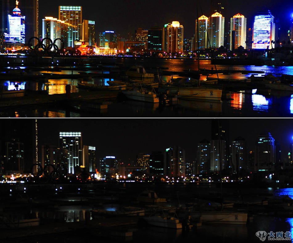 3月31日晚,青岛市多处建筑熄灯(下),响应“地球一小时”活动。