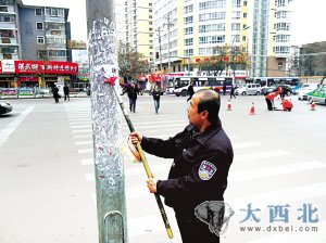初春的阳光格外温暖。王树元沿街一路清理后,迈着疲倦的步子向社区走去。但在定西南路路口,他无奈地看到,一小时前刚刚清理干净的电线杆上,又被贴上了几块小广告。王树元快步走了过去,举起了手中的铲刀。十几秒一个,总共七八个小广告几分钟就清除掉了,动作快得让人有些目不暇接。