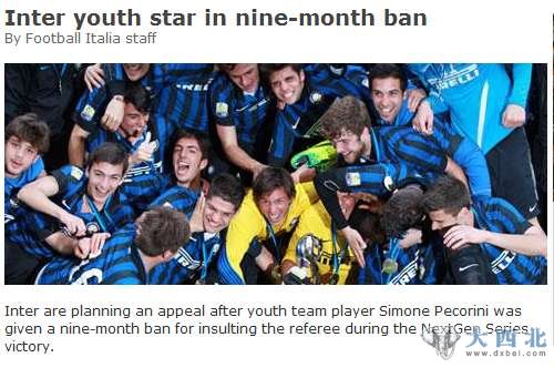 国米青年队小将佩克里尼被禁赛9个月