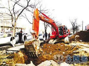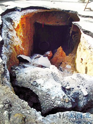 塌陷的坑中明显可见由红砖砌成的污水管道已经被塌下去的土方砸得粉碎。张工说,这种由红砖砌成的污水管道大约是上世纪50年代建成的,经过污水的渗透和长时期的使用,管道已严重老化,所以导致土方下沉,造成路面塌陷。目前,抢修中最大的难题就是管道被毁坏之后,污水乱流,他们只得采取截流的办法,将污水用专用设备引到其它下水井里。将渗水层整个挖出,重新回填三合土,按标准夯实后再按相关流程进行施工处理。