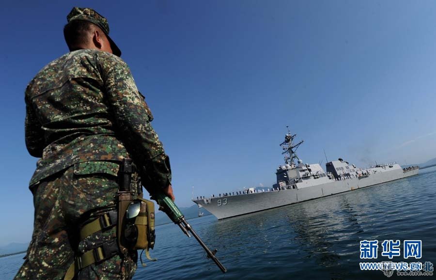 资料图片:参加美菲年度海上联合军演的美军“钟云”号导弹驱逐舰抵达菲律宾巴拉望省普林塞萨港。新华社/法新