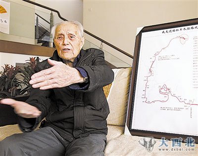 图10 99岁的老红军张力雄,身体硬朗,耳聪目明,声音洪亮。他年少时在家乡参加农民暴动,参加红军后经历了第四次、五次反“围剿”,长征中3次翻越大雪山。身经大小300多仗。1936年,他任红军西路军第5军45团政委,率部参加了高台大血战,被炸伤。部队失利后,他化装成农民,帮人扛活、要饭,辗转千里,回到延安。