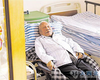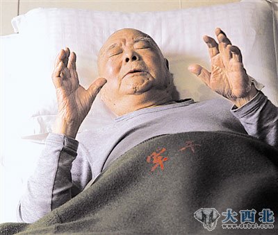 图7 躺在病床上的红军战士吴大奎患冠心病、脑梗塞、糖尿病、青光眼、白内障,已入院8年,有听力,有思维能力,语言含糊不清。从他的陪护嘴里得知,他早年参加红25军,跟着徐海东长征到延安。作战中头部4次受伤,腿部曾中4弹。1947年2月被华野3纵授予“三级人民英雄”荣誉称号。记者问他的战斗经历,他用手比划,口中含混不清地说道:“脑袋打坏了,腿打坏了……淮海战役……孟良崮……打游击……打日本鬼子……打炮楼。”指着腿比划:“枪打的,炮打的……”