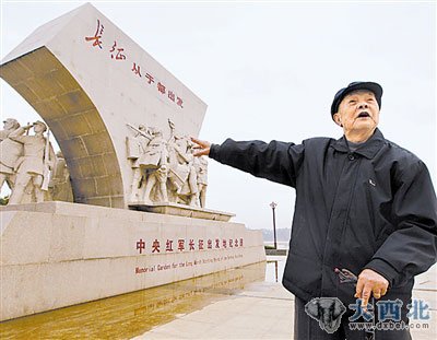 图8 老红军钟明从于都出发,走完二万五千里长征全程。2012年3月15日,在江西省于都县中央红军出发地纪念园雕塑前,钟明激情讲述了红军开始长征渡河的情景,他说:“于都河宽600米,水深1-3米。过河要搭浮桥,当地老百姓把木板、门板贡献出来,一位老人把自己的棺材献了出来。”